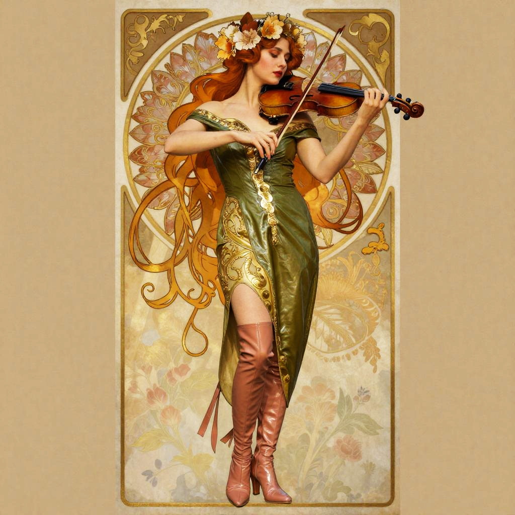 Image in the style of Art Nouveau Alphonse Mucha, nostalgic bohemian violinist, long sun-kissed finger waves with floral crown, lithe, elongated silhouette, (Leather & Latex Off-Shoulder Dress:1.3), moss-green embossed leather off-shoulder dress with gold-filigree latex panels, tea-rose thigh-high latex boots with ribboned ankle straps, ornamental gilded floral studio backdrop with soft sepia glow studio background