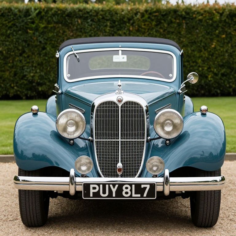 Photograph of a restored, classic blue vintage car with chrome details, "PUT 837" license plate, front-facing on gravel, with lush green