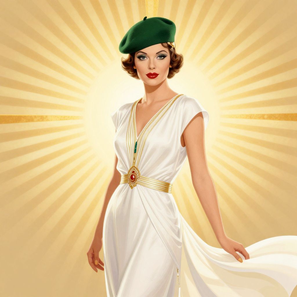 Digital illustration of a glamorous woman in a white, sleeveless dress with a gold belt, green beret, and red lipstick, standing against a radiant