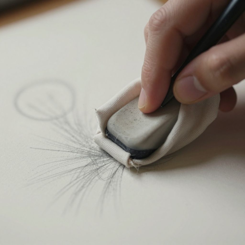 Cloth eraser in the process of wiping away pencil sketches on textured paper, fibers slightly unraveling, dynamic motion blur, high detail close-up showing charcoal smudges lifting, painterly background with artistic chaos, soft ambient light.