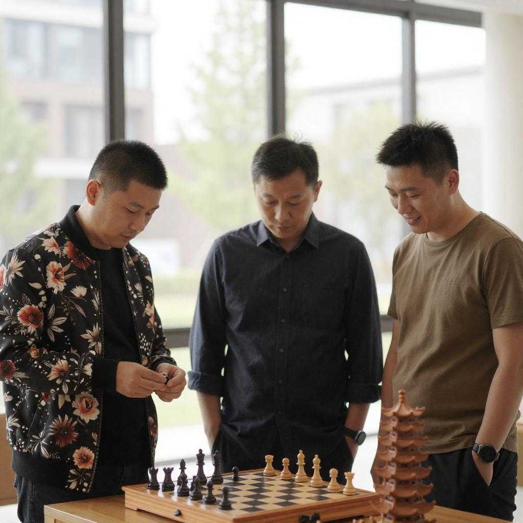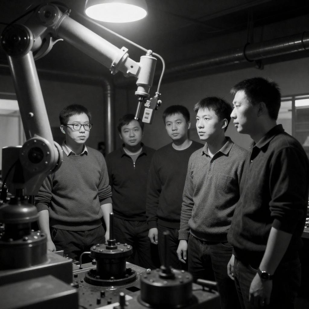 Black-and-white photograph of five Asian men in a dimly lit room, surrounded by industrial machinery. One man in glasses and a sweater stands left, while the others wear casual clothes. A large, mechanical arm looms overhead. The men look focused, with one holding a tool. The background includes pipes and a circular light.