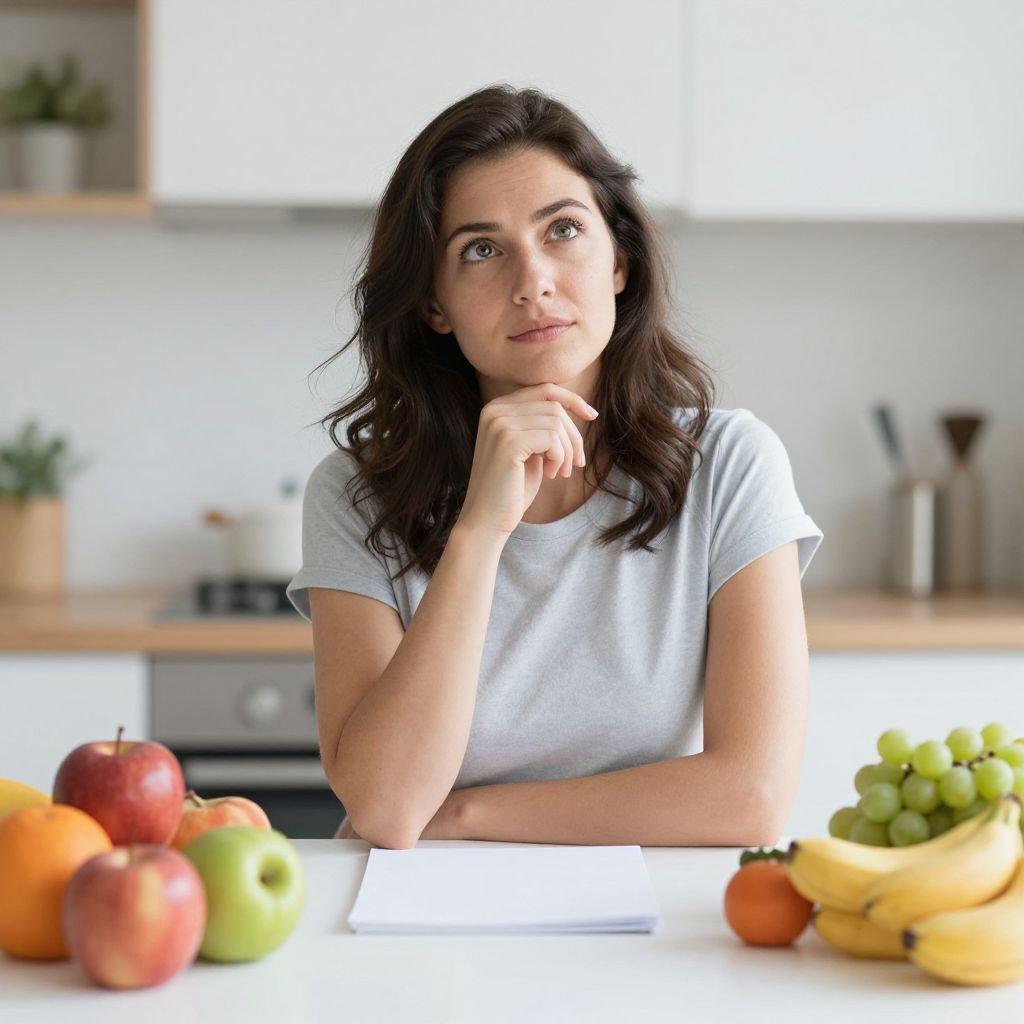 Photograph of a young woman with medium-length, wavy dark brown hair, wearing a light gray t-shirt, sitting at a white kitchen counter. She rests her chin on her right hand, looking thoughtfully to the side. In the foreground, there is a colorful assortment of fresh fruits including red and green apples, oranges, bananas, and a bunch of green grapes. The background features a modern kitchen with white cabinets, a wooden countertop, and a few kitchen utensils. The lighting is bright and natural, highlighting the woman's fair skin and the vibrant colors of the fruits.