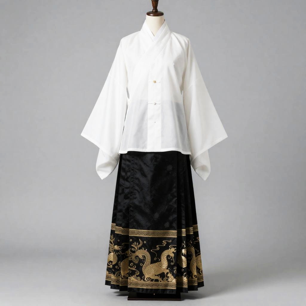 Masterpiece, best quality, realistic, simple background, hanfu, ming style outfits, white short coat, yunjian, black mamian skirt