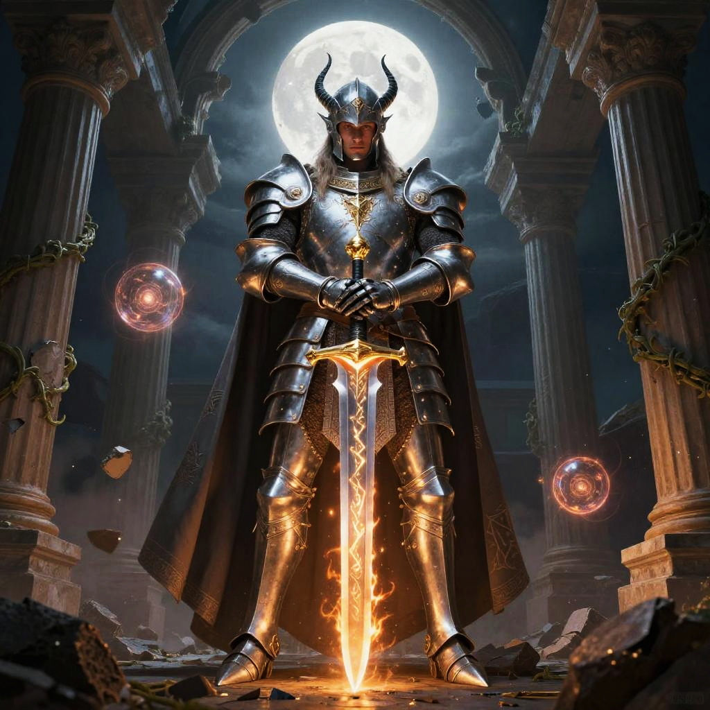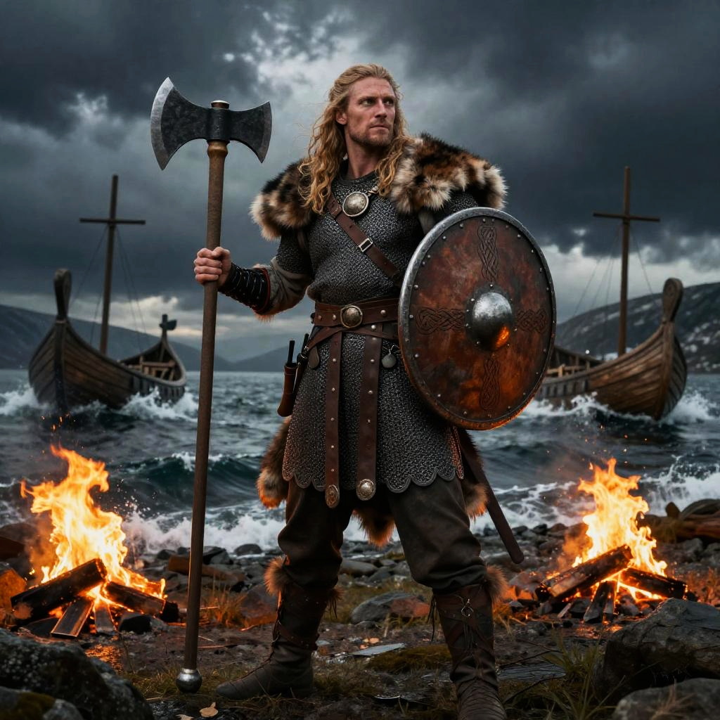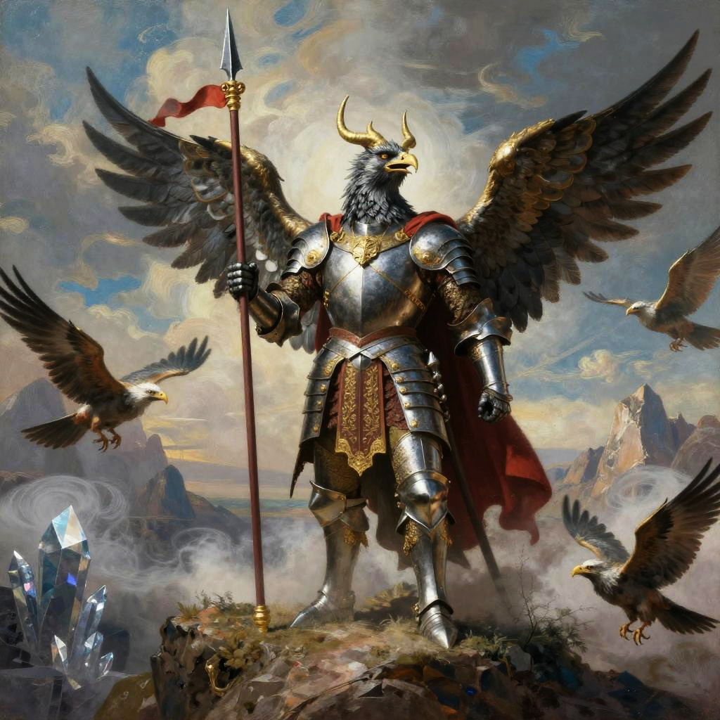 Proud centaur chieftain standing majestically in the rolling grasslands at dusk, dressed in tribal leather chestplate adorned with feathers. He holds a heavy war spear firmly, projecting strength and leadership. Surrounding him are herds of wild horses, fire pits, and distant tribal tents, creating a dynamic and epic scene. The lighting highlights his muscular physique and resolute expression, with a dramatic sky above that adds a sense of divine or mythological grandeur. Rendered in a highly detailed, classical painting style inspired by the Renaissance, capturing both realism and dramatic storytelling.
