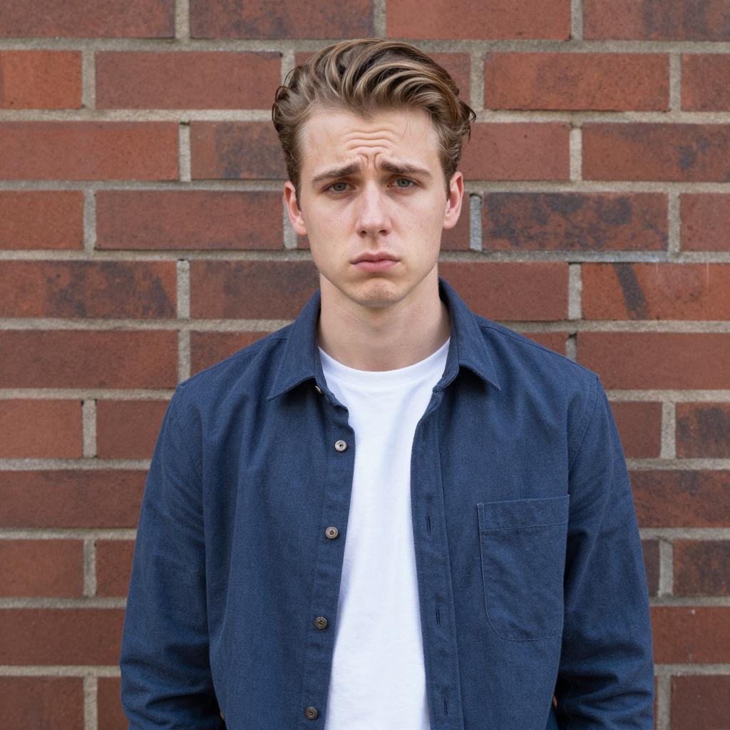 A young man with light brown, slicked-back hair, wearing a blue shirt over a white t-shirt, standing against a red brick wall. His facial expression is slightly concerned or focused. He is centered in the frame. The background is a ured brick wall.