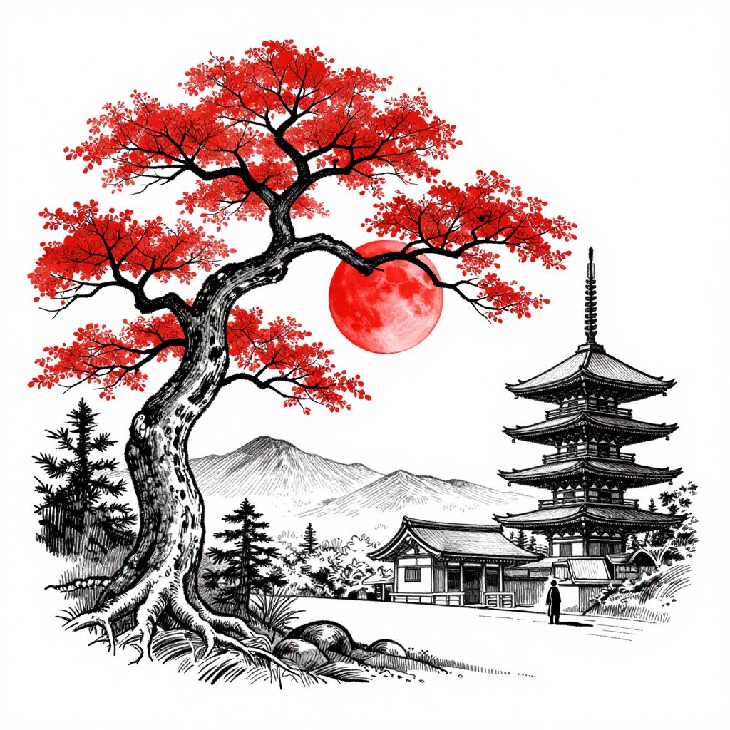 The image is a pen line drawing of a Japanese scene with a red moon in the center, set against a white background. The scene features a large, twisted tree with red leaves on the left, casting a dramatic silhouette against the moon. In the background, there are mountains and a traditional Japanese pagoda, both rendered in black and white. A lone figure stands near the pagoda, adding a sense of scale and human presence to the scene. The overall composition is balanced, with the tree and moon creating a focal point, while the pagoda and figure provide depth and context. The interplay of red and black elements creates a striking contrast, emphasizing the serene yet powerful atmosphere of the Japanese landscape.