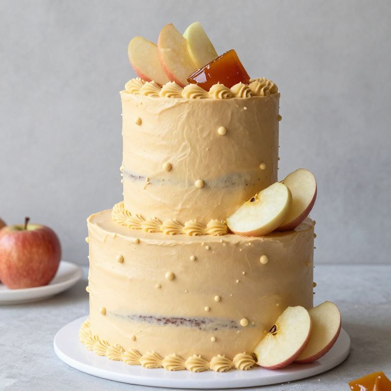Tall, three-tiered semi-naked cake with smooth apple butter frosting, adorned with piped dots and fresh apple slices topped with a caramelized apple piece, presented on a white plate by Bird On A Cake.