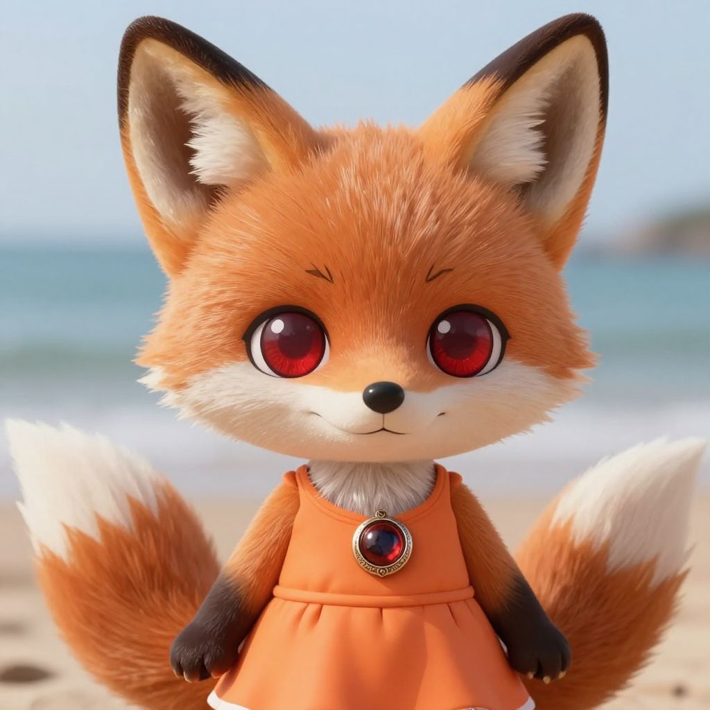 This is a digital illustration of a cute, anthropomorphic baby fox with large, shiny red eyes, a small black nose, and fluffy orange fur with white accents on its face, chest, and tail tip. The fox is wearing an orange dress with a round, dark gemstone pendant at the neckline. Its ears are pointed and have black tips. The background shows a blurred beach scene with blue sky and ocean, creating a soft, serene atmosphere. The fox's expression is innocent and slightly curious, enhancing its charming appearance. The overall style is highly detailed and vibrant, resembling a realistic yet whimsical cartoon.