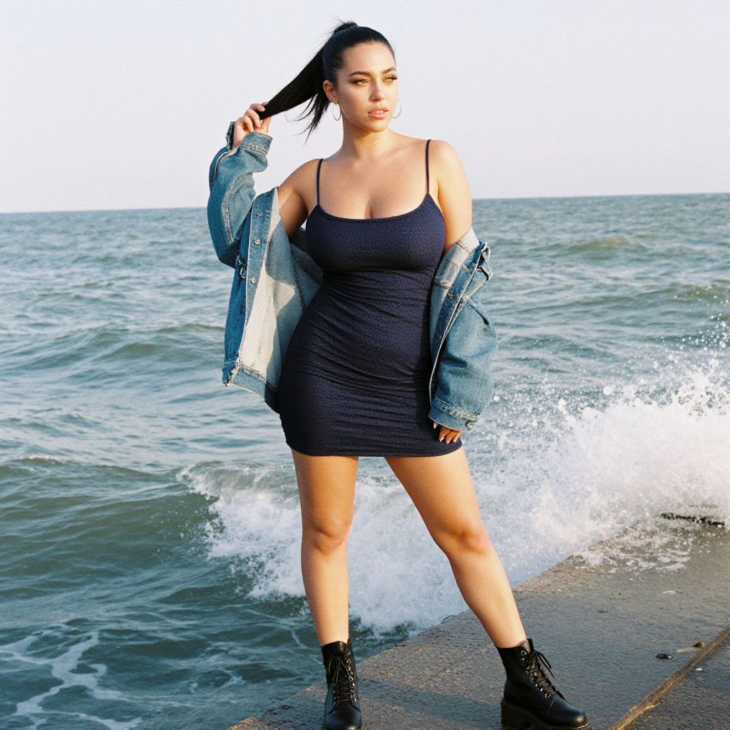 A woman, styled in kodachrome analog film, wearing a textured navy blue mini dress with spaghetti straps and a layered oversized denim jacket, paired with black chunky lace-up boots. She stands on a fishing pier with waves crashing around her, minimalist gold hoop earrings glinting in the sunlight, her casual ponytail held with a scrunchie. Sexy. Pretty face and beаutiful eyes. Big breasts