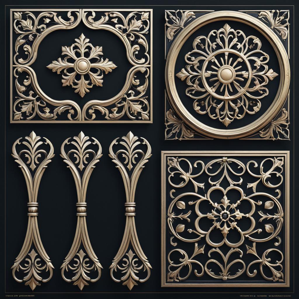 Photorealistic asset sheet featuring a collection of classical decorative ornaments in gold tones on a black background. Includes intricate floral and scrollwork designs in rectangular and circular frames, showcasing detailed craftsmanship and baroque style influences. Ultra sharp and highly detailed digital illustration suitable for architectural and design references.