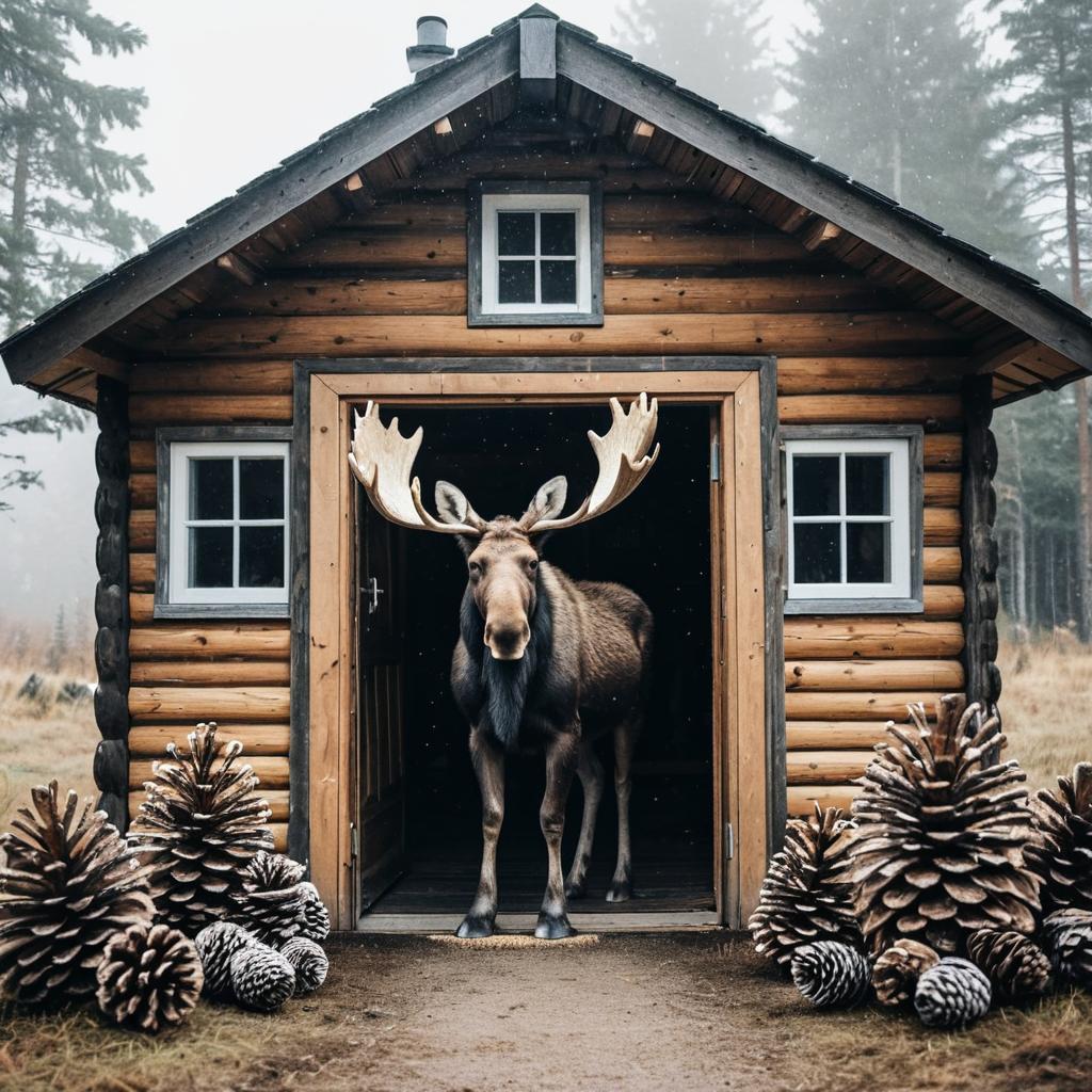 A moose stands at the open door of a small log cabin in a foggy forest setting, surrounded by large pine cones on either side of the cabin entrance. The scene evokes a calm, misty morning atmosphere in a rural countryside location.