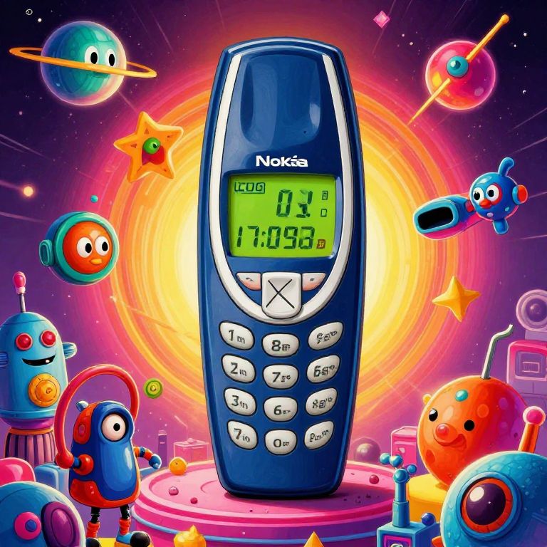 Advertising 1980s movie poster featuring a cartoony and scifi theme bright and colorful with a nokia telephone as the centerpiece no border fill the screen,