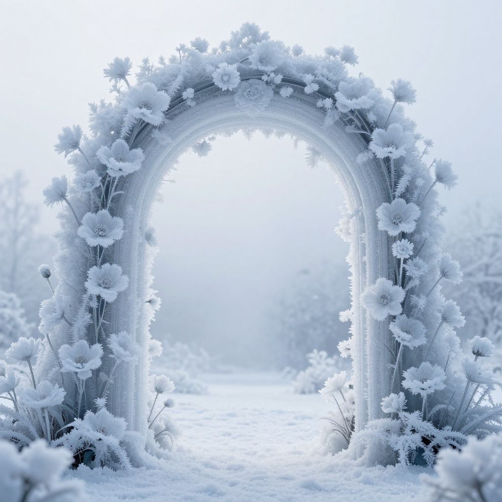 A serene arched gateway covered in delicate frost flowers and ice crystals, standing amid a snowy, misty winter landscape. The icy blooms and intricate frost patterns create a peaceful, enchanting entrance symbolizing winter's quiet beauty and transformation.