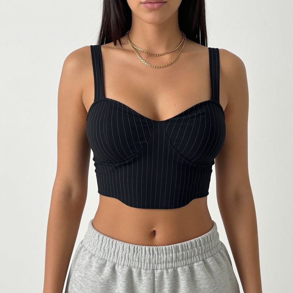 Photograph of a young woman with straight, black hair, shown from the waist up. She wears a black, pinstriped, spaghetti-strap crop top that highlights her medium-sized breasts. She also wears light gray, drawstring sweatpants that sit just below her navel. Around her neck is a gold chain necklace. Her skin tone is light brown, and her lips are slightly parted, showing a hint of pink lipstick. The background is plain white, making her the focal point of the image. The image has a clean, polished look with sharp focus and vibrant colors.