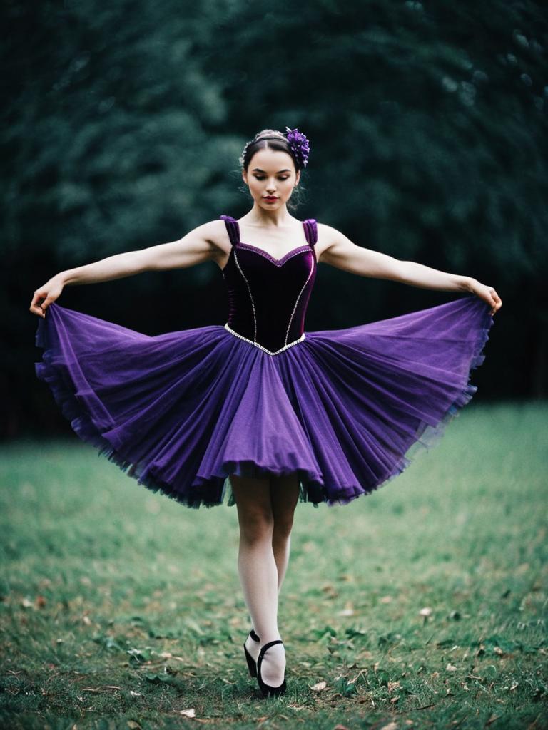 A young female ballerina stands outdoors on grass, wearing a dark purple dance costume with a voluminous tulle skirt and fitted bodice. She poses gracefully with her arms extended holding the skirt, wearing ballet shoes and a matching purple flower hair accessory. The background is blurred, highlighting the dancer in a natural setting.