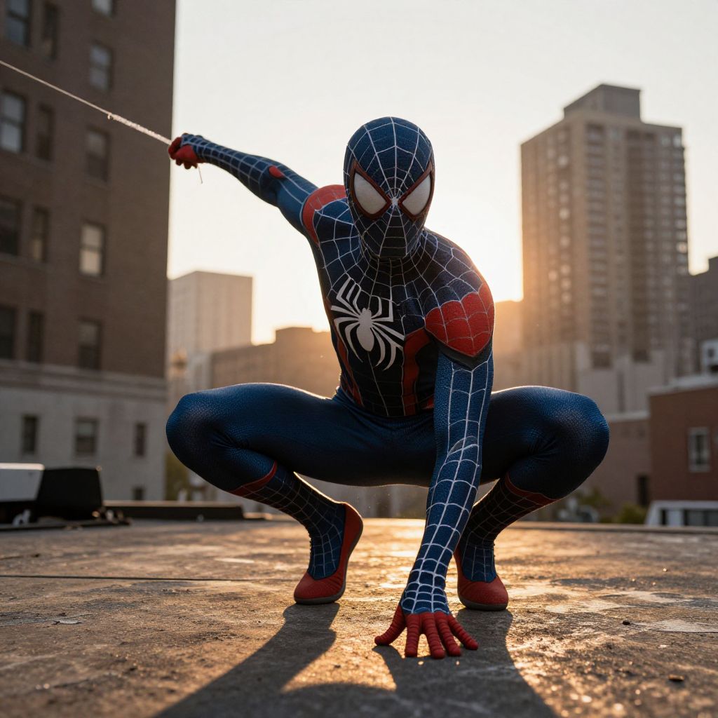 Photograph of a person in a Spider-Man costume, squatting on a rooftop at sunset. The costume is a tight, blue, black, and red suit with white web patterns, red spider emblem on the chest, and red webbed gloves and shoes. The person's face is obscured by the black mask. Sunlight casts long shadows, highlighting the textured rooftop. Background features tall city buildings with windows, creating a dramatic urban skyline. The person holds a wire in their right hand, poised for action. The image has a dynamic, action-hero feel.