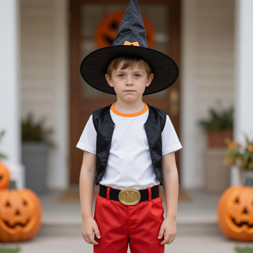 Photograph of a young Caucasian boy with light brown hair, wearing a black witch hat, white t-shirt with orange trim, red pants, and black vest. He stands in front of a house with a blurred brown door, white columns, and two orange jack-o'-lanterns on either side. The boy's expression is neutral, and he wears a gold belt buckle. The background includes potted plants and a hint of fall decorations. The image has a slightly over-saturated, cartoonish style.