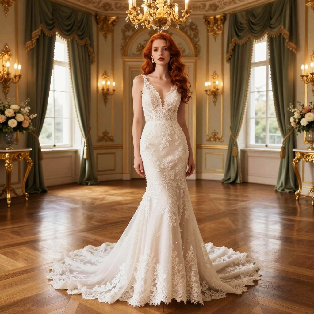 Photograph of a redheaded woman with long, wavy hair standing in a grand, ornately decorated room. She's wearing a full, white lace wedding dress with a deep V-neck and a long train. The room features gold accents, large windows with draped curtains, and chandeliers. The wooden floor and elegant furniture add to the luxurious setting. Her expression is calm and confident.