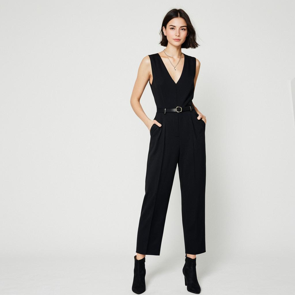 Woman, casual chic, cropped navy blue tank top, round neckline, black skinny jeans, mid-rise waistband with belt loops and button closure, ankle-length hem, black ankle boots with a slight heel, minimal jewelry, white studio background