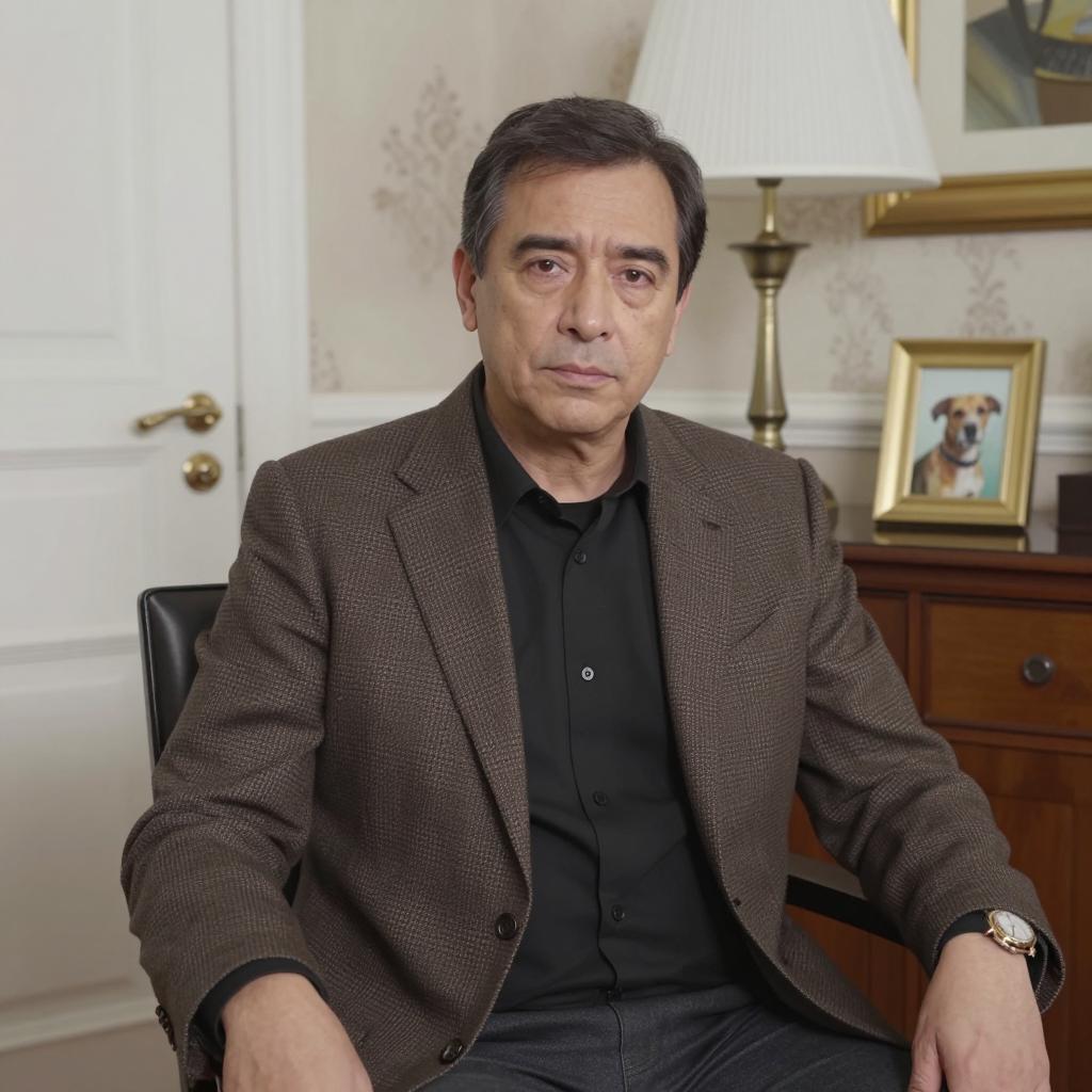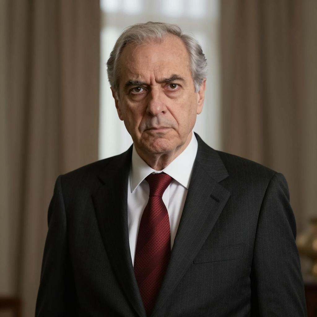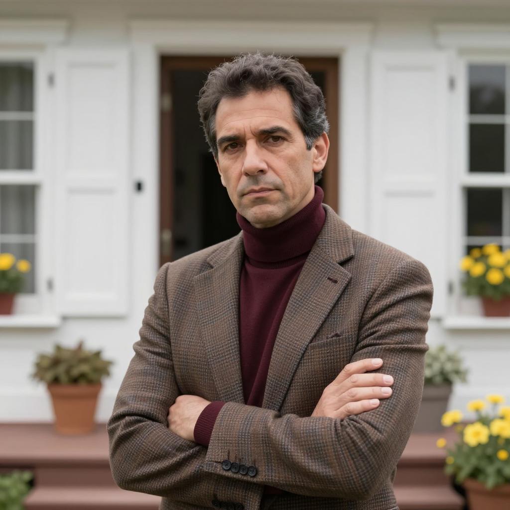 Photograph of a middle-aged man with short dark hair, wearing a light blue suit and white shirt, looking serious. Background includes a blurred door and window. Man's face is slightly shadowed. Light blue suit contrasts with white shirt.