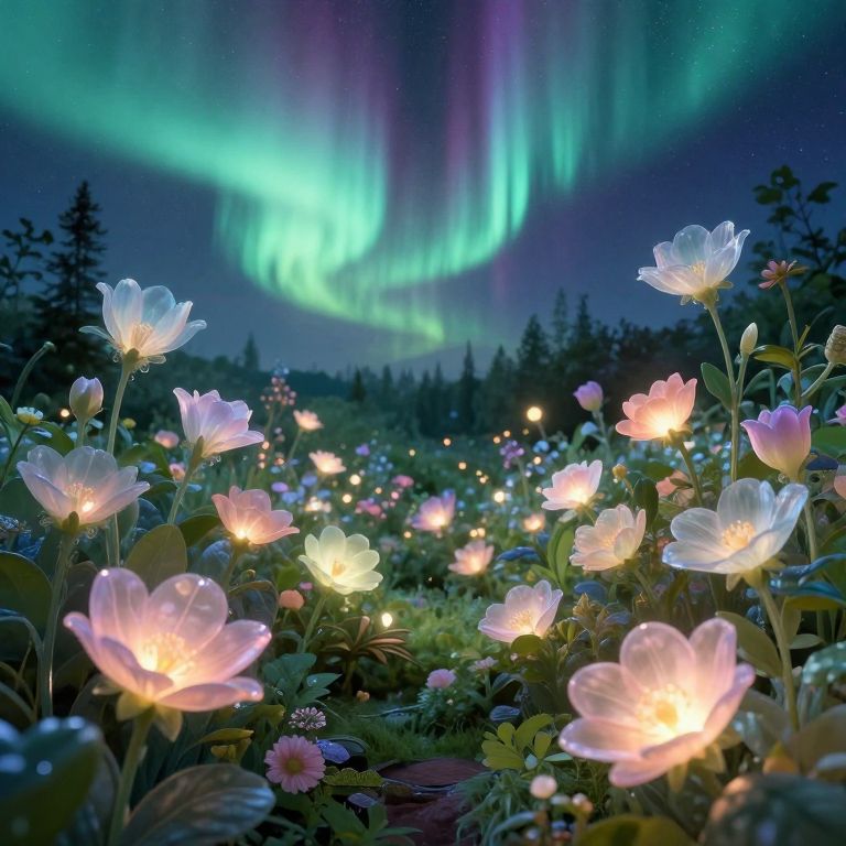 Craft an alluring digital artwork depicting an enigmatic garden aglow with celestial auroras. The scene is to be viewed from above, revealing diverse, translucent flowers at various growth stages. These luminous blossoms should cast gentle shadows on the verdant foliage below, fostering a surreal ambiance. The color palette should harmonize tender pastels with striking hues, instilling a sense of marvel and intrigue as if the garden bridges reality and fantasy realms. This captivating landscape should evoke admiration for nature's splendor while kindling curiosity about the unexplored, reminiscent of an artist who envisioned extraordinary landscapes.