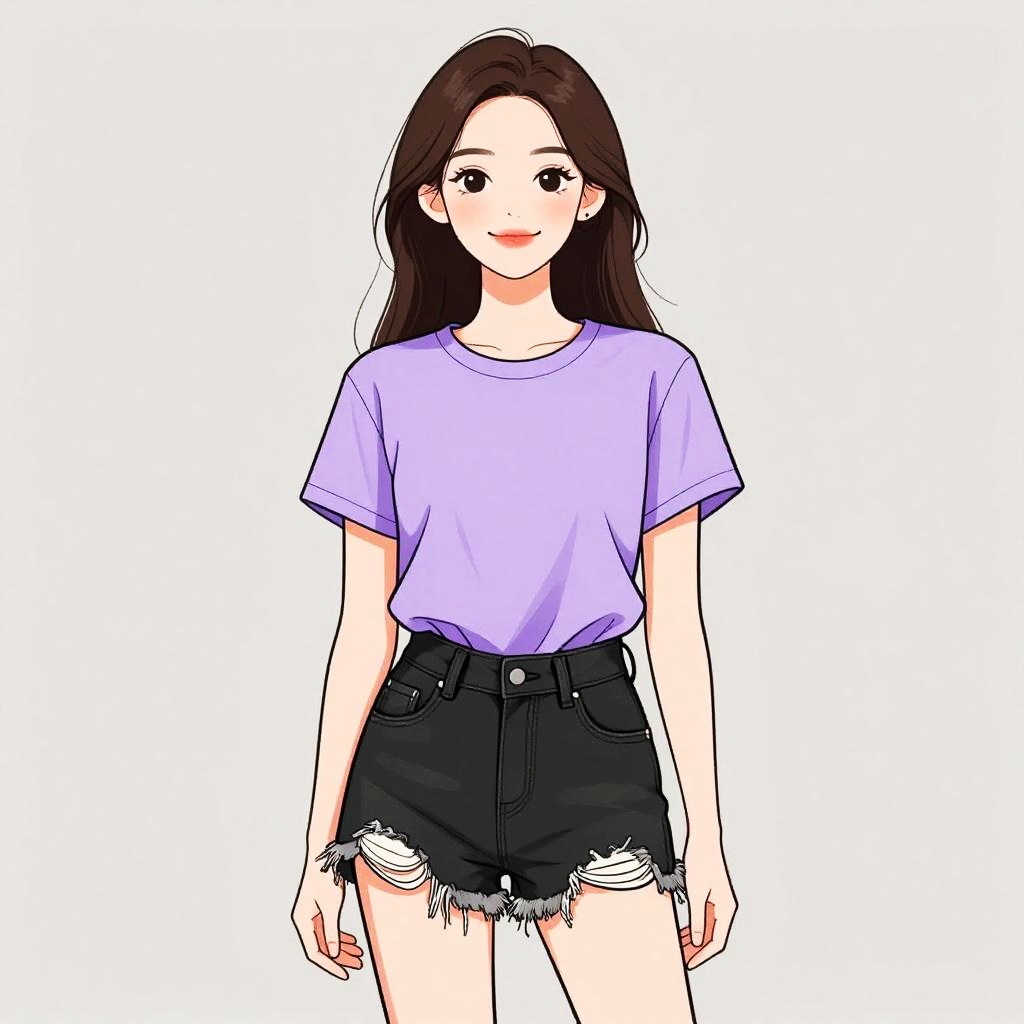 Woman with pretty face and pretty hair. Woman, casual, plaid button-up short-sleeved shirt with a collar, black shorts with frayed hems, accessorized with a black clutch and multiple bangle bracelets. --sref 1467
