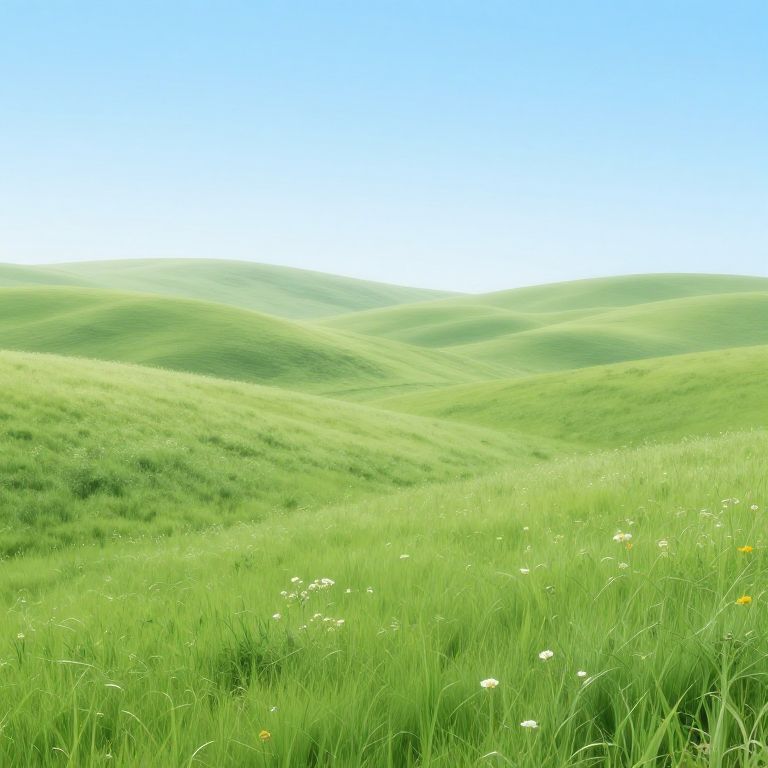 Photograph of a lush, green hillside landscape under a clear, bright blue sky. The rolling hills are covered in vibrant green grass, dotted with small white and yellow wildflowers in the foreground. The grass appears soft and slightly swaying, creating a gentle, undulating texture across the hills. The sunlight illuminates the scene, casting subtle shadows that enhance the contours of the hills. The overall mood is serene and refreshing, evoking a sense of tranquility and natural beauty.