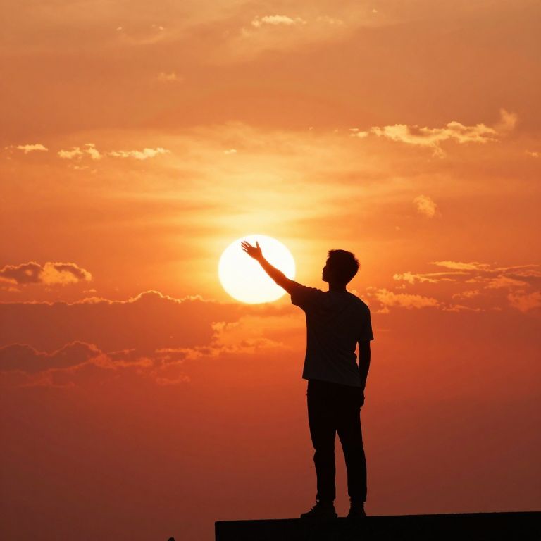 Photograph of a silhouetted man standing on a ledge, arms raised towards a vibrant orange and red sunset. The man's outline is dark against the glowing sky, wearing a short-sleeved shirt and pants. The sun is partially obscured by clouds, creating a bright, radiant halo effect. The background features a gradient of warm colors, from deep red at the bottom to lighter orange near the top. The man's silhouette is centered, with the sun directly behind him. The overall mood is serene and contemplative.