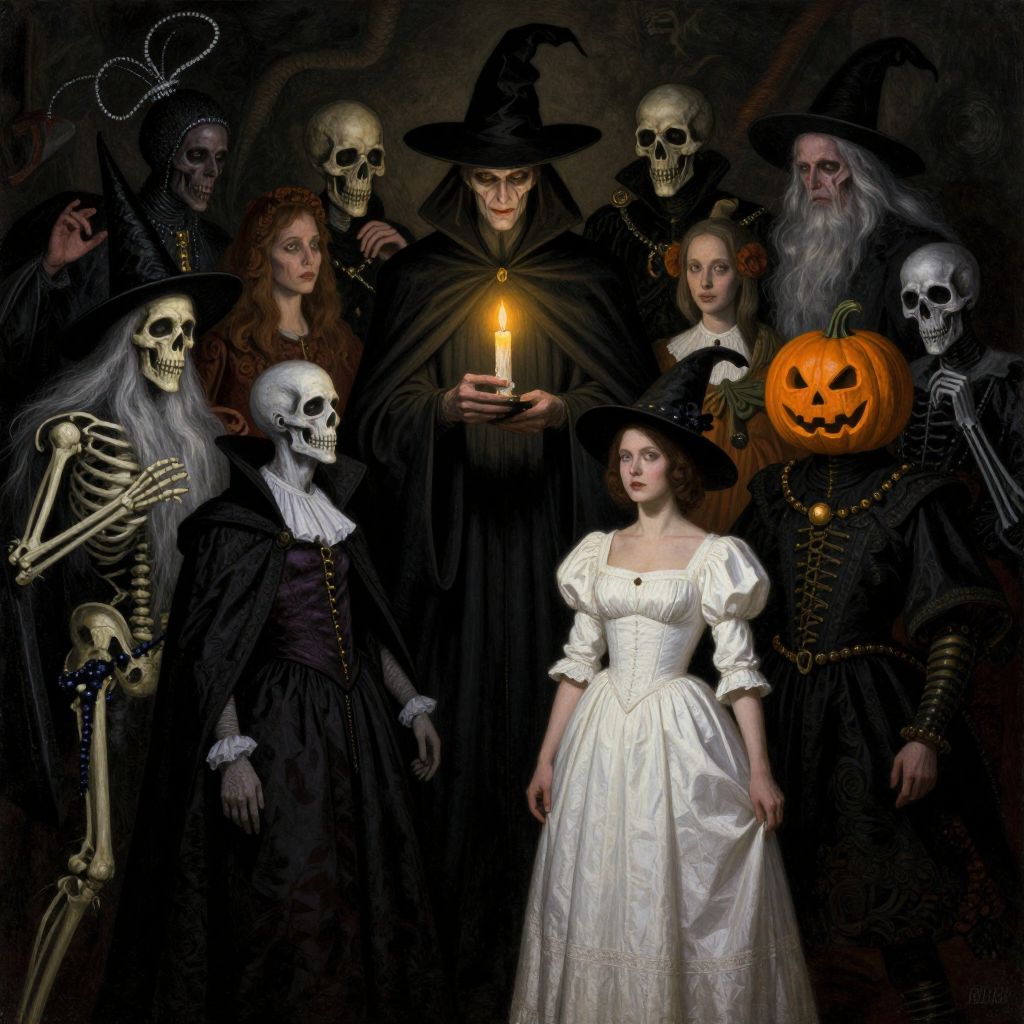 This digital painting depicts a dark, eerie Halloween scene. At the center, a young woman in a white, Victorian-style dress with puffed sleeves stands illuminated by a single lit candle held by a central figure in a black witch's cloak and hat. Surrounding her are six eerie figures: two with skull heads, one with skeletal hands, one with a glowing Jack-o'-lantern face, and two elderly men with white beards. The background is shadowy, adding to the spooky atmosphere. The contrast between the white dress and dark background highlights the central figure and the candlelight. The overall style is gothic and macabre, with rich, dark colors and detailed textures.