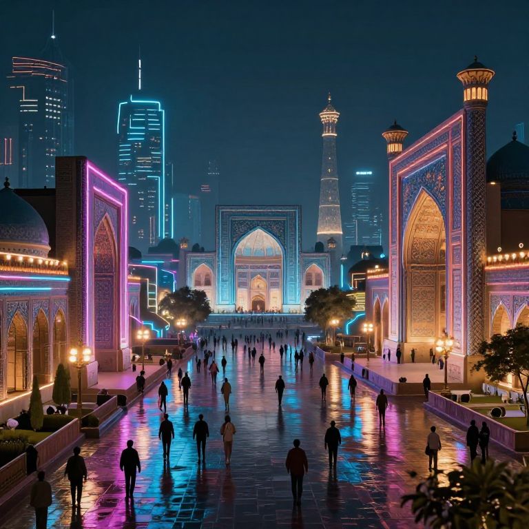 AI prompt Pakistan: A futuristic digital landscape in Pakistan, where ai-generated art is being created in bustling urban centers like Lahore and Islamabad, blending traditional heritage with modern technology, neon lights reflecting on wet pavements, cyberpunk style.