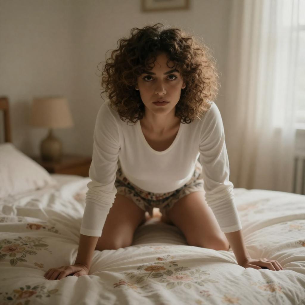 Photograph of a woman with curly brown hair, wearing a white long-sleeve shirt and blue pants, crouching on a wooden floor in a dimly lit, wooden-paneled room. She has a focused expression, with shadows highlighting her face and hands.