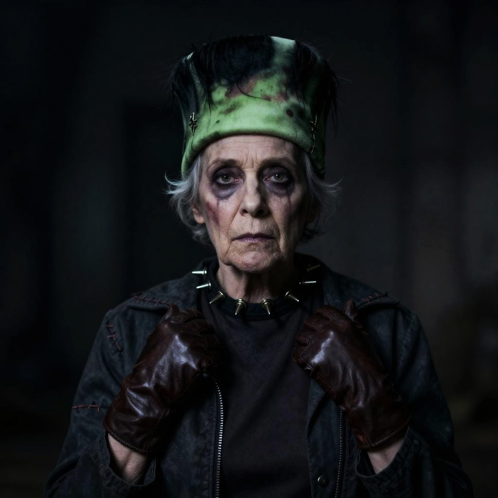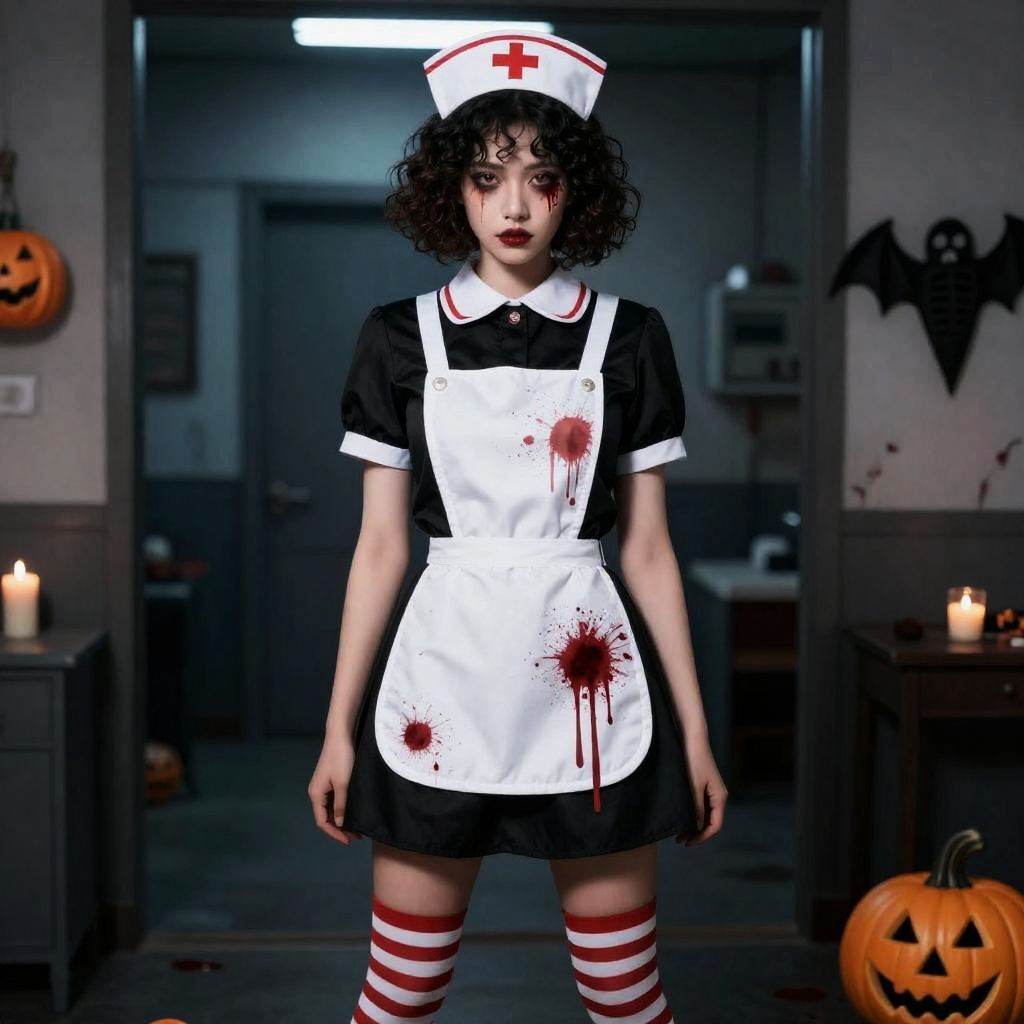 Middle-aged male, Athletic toned, Messy short hair, halloween outfit, Zombie nurse costume with ripped apron and blood stains, old nurse cap, gritty horror atmosphere