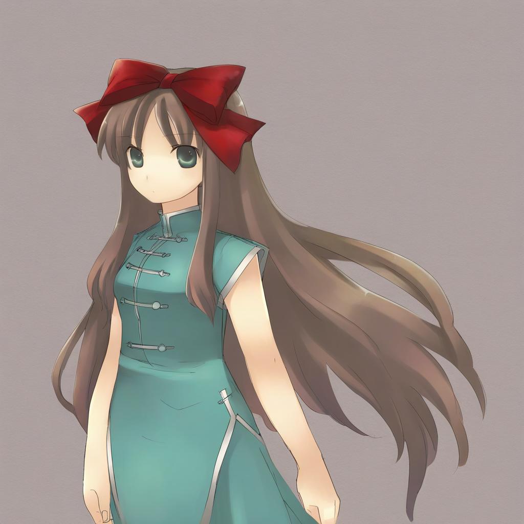 Arima miyako, tsukihime, 1girl, green eyes, long hair, brown hair, hair bow, tangzhuang, by artist eiji (eiji), leet