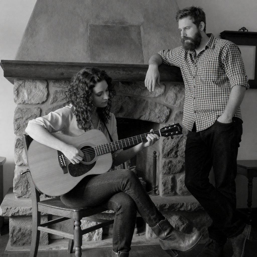 Black and white photo of a young woman with curly hair playing an acoustic guitar while seated on a wooden chair in a rustic room with a stone fireplace. A bearded man in a checkered shirt and dark pants stands nearby, leaning on the fireplace mantel and watching her play. The cozy setting captures a casual, intimate moment between the two individuals.