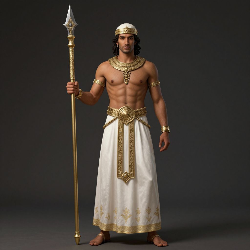 Photograph of a muscular, dark-skinned man with long black hair wearing an ancient Egyptian-style outfit. He is shirtless, adorned with a gold headpiece, necklace, armlets, and a white loincloth with gold accents. He holds a tall, ornate golden spear in his right hand. His expression is serious, and he stands barefoot against a dark gray background. The loincloth has a central gold circular emblem and gold floral patterns near the hem. The lighting highlights his defined muscles and the gleaming gold accessories.