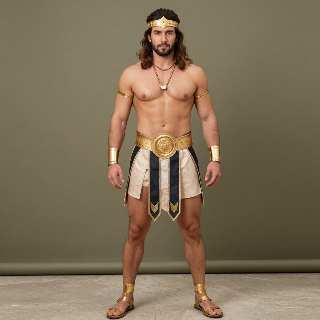 Photograph of a muscular, dark-skinned man with long black hair, wearing ancient Egyptian attire: white skirt, gold jewelry, and holding a tall