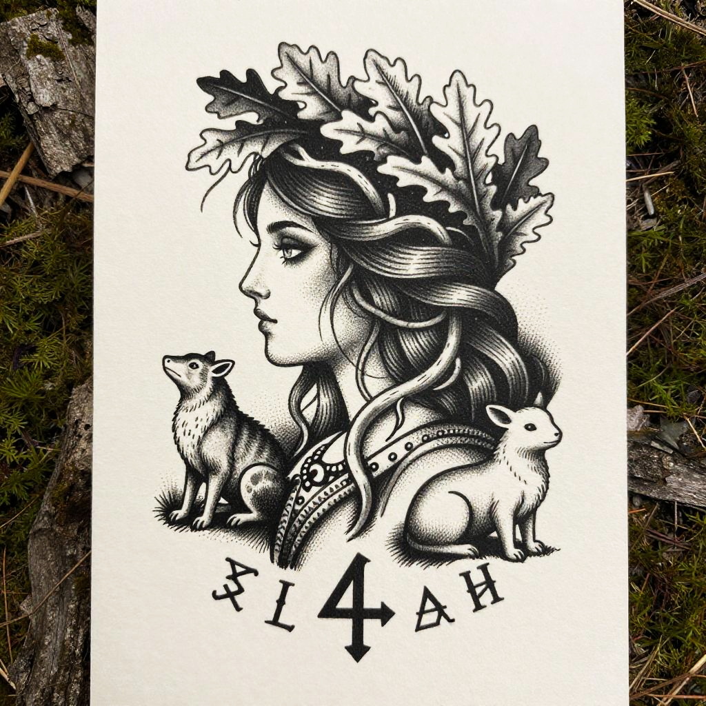 Monochrome ink illustration in a vintage tattoo flash aesthetic featuring mystical druidess in profile with entwined vines as hair, framed by oak leaf crown above, woodland creatures flanking, and ancient symbol runes below. Printed on dense moss-covered bark, with crisp linework, stippling and crosshatching, bold negative space, subtle vignette, museum-print finish, high contrast, fine detail, gritty yet elegant mood.