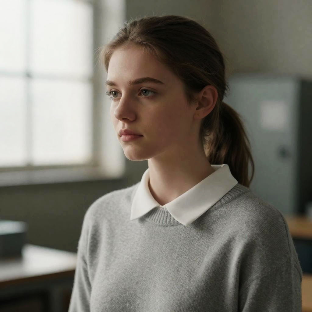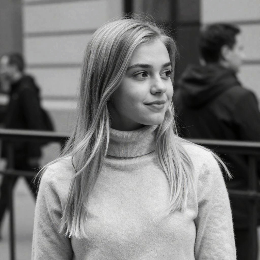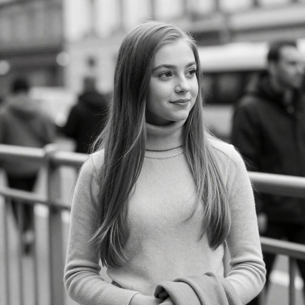 Black-and-white photograph of a young woman with long, straight, light-colored hair, wearing a ribbed, long-sleeve turtleneck sweater. She looks to the right with a slight smile. Background includes blurred railings and indistinct figures. She holds a scarf in her hands.