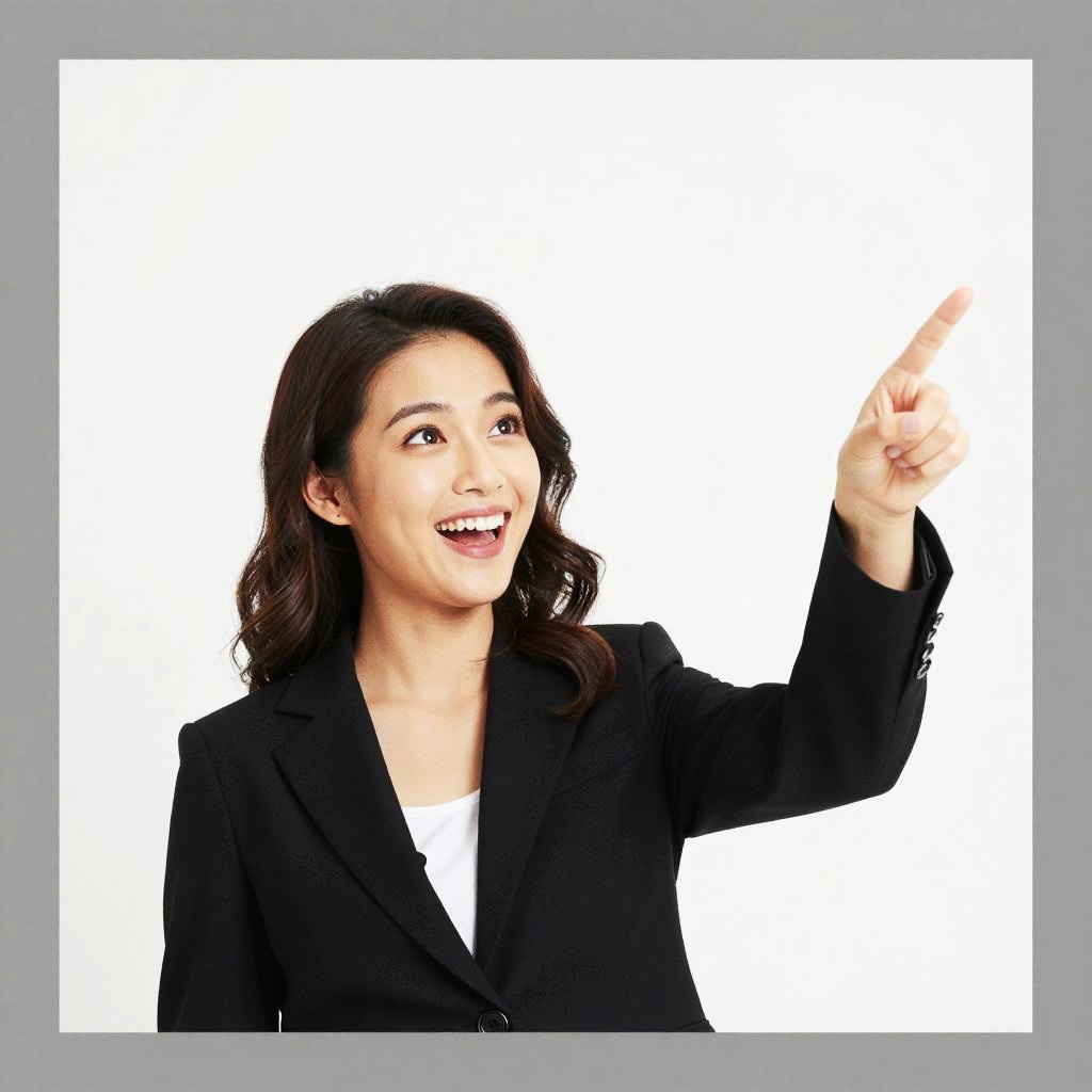 Photograph of a smiling woman with shoulder-length dark brown hair, wearing a black blazer over a blue shirt. She's holding a black pen in her right hand, raised slightly, with her left arm crossed over her chest. She's looking to the right with a cheerful expression. The background is a solid white with grey borders on either side.