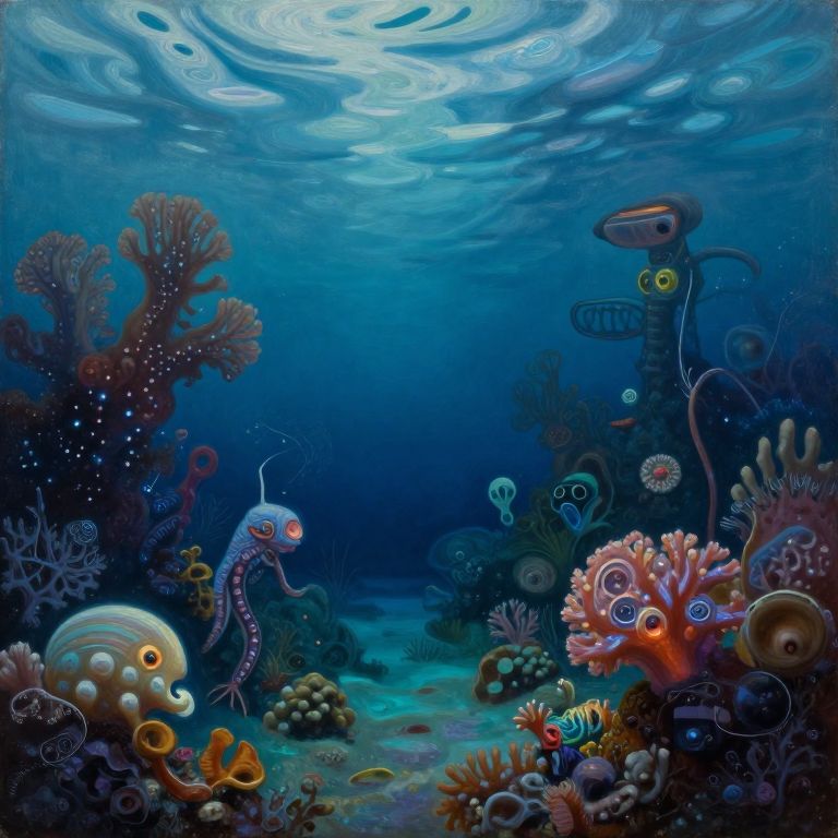 A hyper-detailed oil painting captures an enchanting underwater realm where reality bends and morphs. The scene showcases a harmonious blend of bioluminescent sea life and otherworldly creatures in a surreal landscape, with shimmering coral formations reminiscent of night sky constellations, creating an emotional gradient between tranquility and awe. A unique camera angle peers through the ripples on the water's surface, offering a dynamic perspective of this fantastical underwater utopia while maintaining the rich textures and colors characteristic of surrealist approaches combined with bio-mechanical influences.