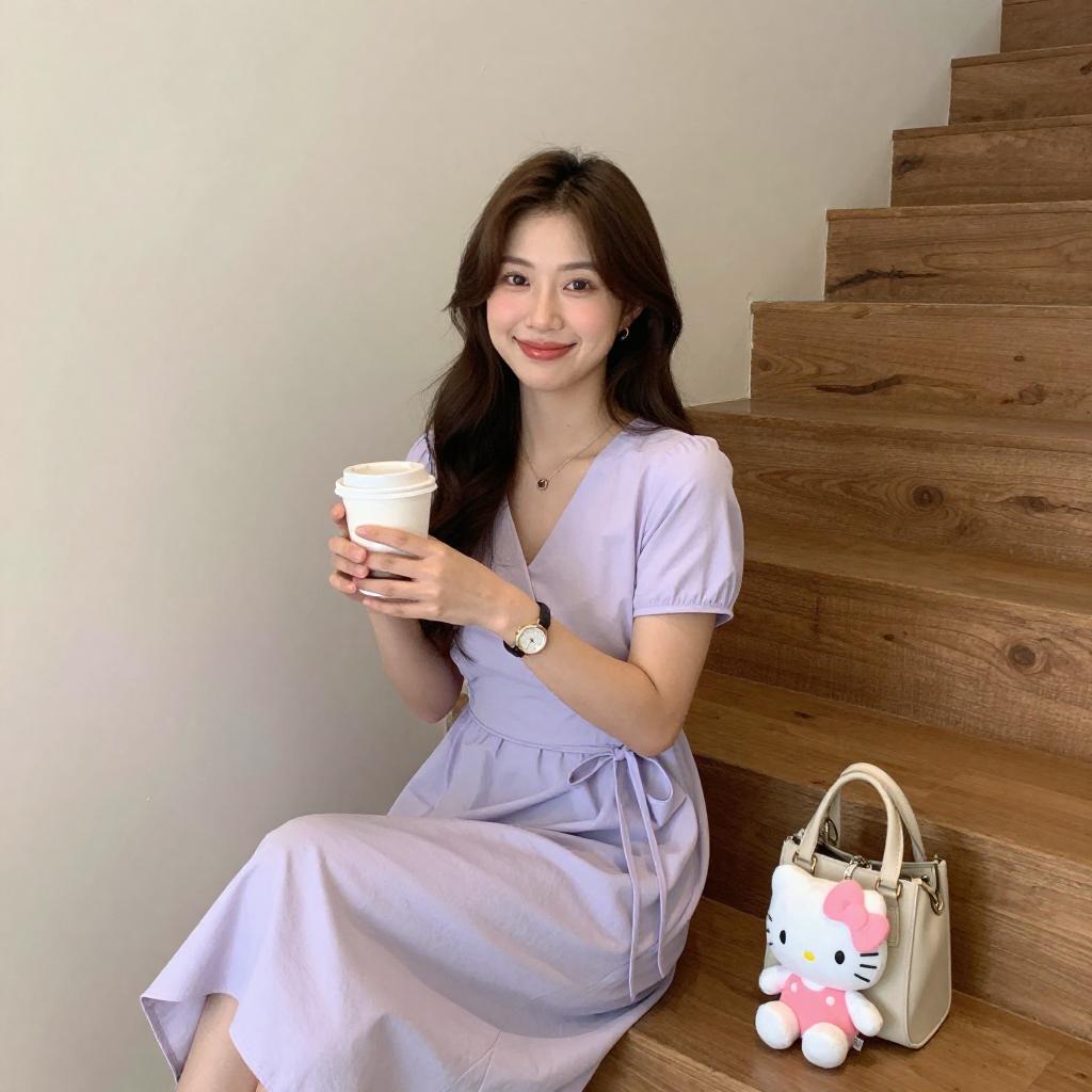 Photograph of a smiling woman with long dark brown hair, wearing a light purple, V-neck dress and a wristwatch, sitting on a wooden floor against a white wall. She holds a coffee cup in her right hand and has a white and pink Hello Kitty plush toy and a beige handbag beside her. A staircase with wooden steps is in the background.