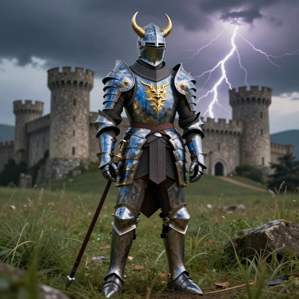 A heavily armored knight standing in a green field with medieval castles in the background. The knight's ornate armor features sharp, horned and dragon-like designs with a reflective blue and gold metallic finish. Lightning streaks across a dramatic stormy sky, enhancing the epic atmosphere.