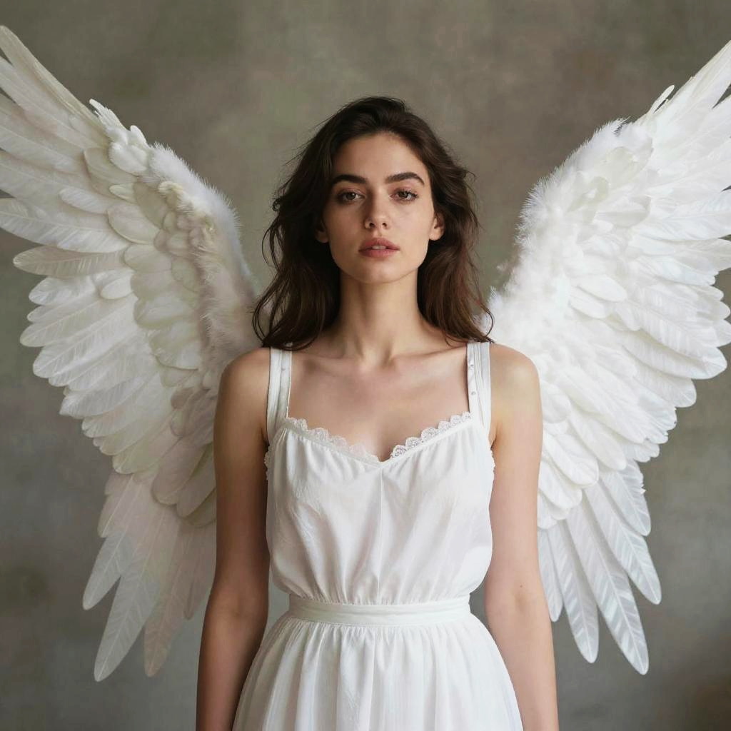 Photograph of a young woman with fair skin and dark, wavy hair, standing against a gray, textured background. She has large, white, feathered angel wings extending from her back. She wears a sleeveless, white, cotton dress with a scalloped neckline and a cinched waist. Her expression is neutral, with slightly parted lips and dark, focused eyes. The lighting highlights the texture of her wings and the fabric of her dress, creating a soft, ethereal effect.