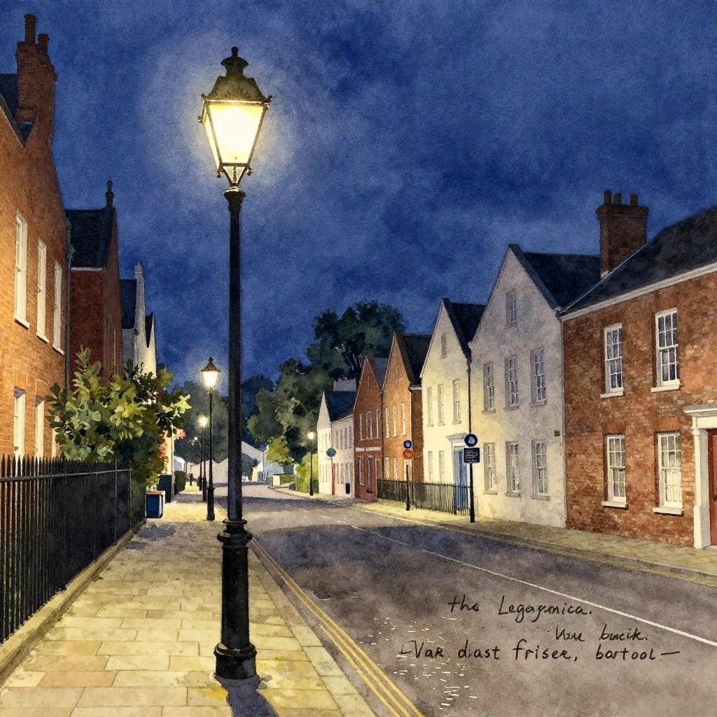 No humans, lamppost, night, traditional media, building, outdoors, scenery, painting (medium), road, english text, city, street, sky, artist name, water, watercolor (medium), cityscape