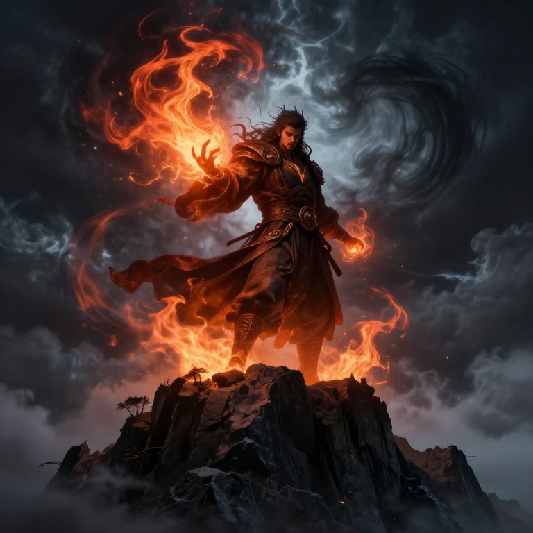 Digital fantasy artwork of a dark, fiery-robed sorcerer with glowing orange flames in his hand, standing on a rocky peak against a stormy,