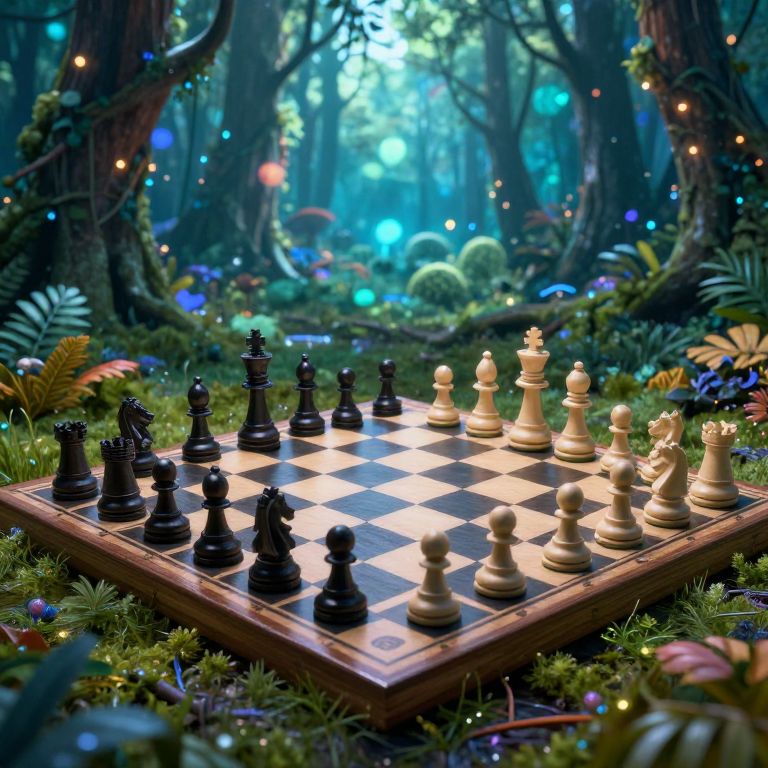 A chessboard sprawls across a bioluminescent forest floor, where living pieces debate strategy in whispered dialects.