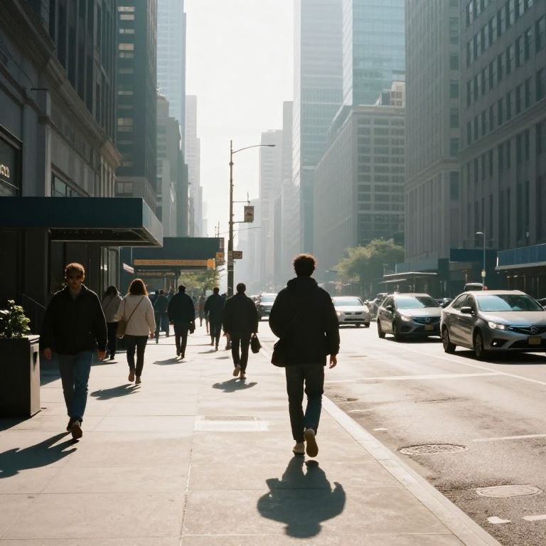 Photograph of a sunlit urban street lined with tall buildings. Silhouetted in the foreground, a person with short hair walks away from the camera, wearing a dark jacket and jeans. To the left, a person with short hair and a light-colored jacket walks towards the camera. Several other pedestrians are scattered along the sidewalk. Cars are parked on the right side, and sunlight casts long shadows. The buildings have a mix of modern and classic architectural styles, with large windows and some greenery visible in the distance. The overall mood is bustling yet serene.