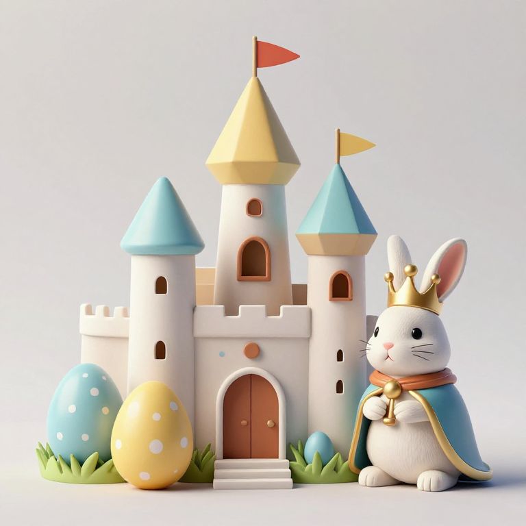 Geometric Shapes An Easter egg castle and a rabbit that is king. Make it realistic, ultra-detailed, very high quality, hyperrealistic, 8k - Upscaled by,