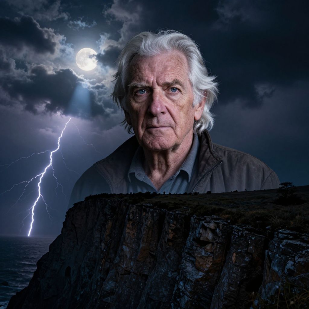 Create a photorealistic double exposure portrait of an elderly man with intense blue eyes, rugged skin, and thick white hair standing on a rocky cliff in silhouette against a stormy night sky backdrop. A single moonbeam illuminates his steadfast expression, while swirling clouds and lightning bolts overlay the scene, adding movement and tension. This evokes a contemplative mood, reflecting resilience amidst life's storms.