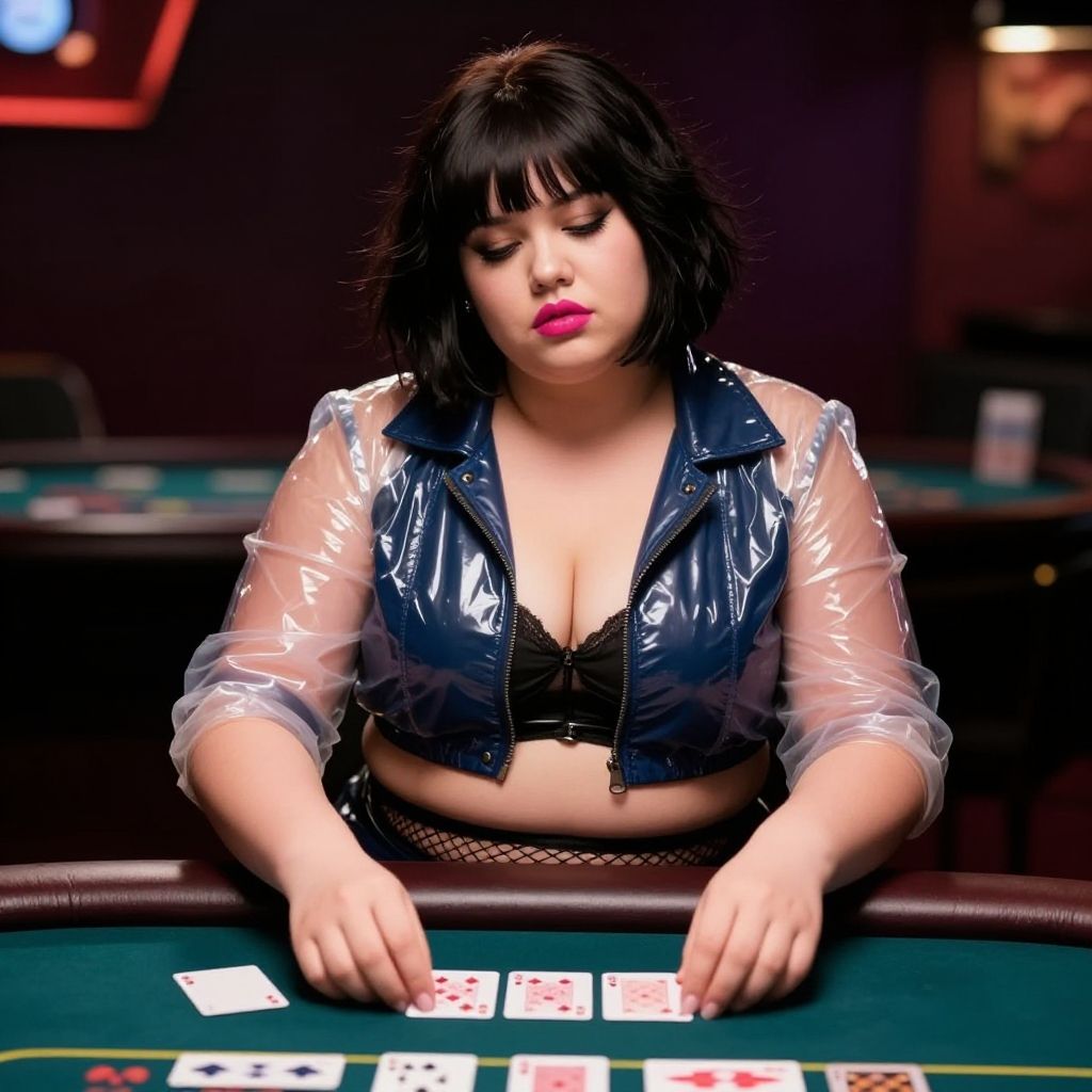 Score_9, score_8_up, score_7_up, 1girl, mature_female, chubby, mature tired face, bright pink lipstick, short bob with bangs hair, messy hair, dark eyeliner, wearing short cropped opened jacket, plastic jacket, miniskirt, black fishnet stockings, playing cards at a casino table, digital art, realistic